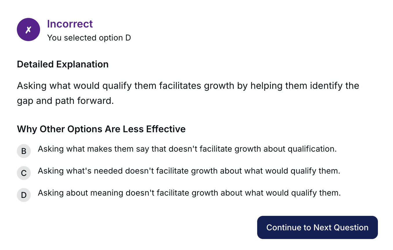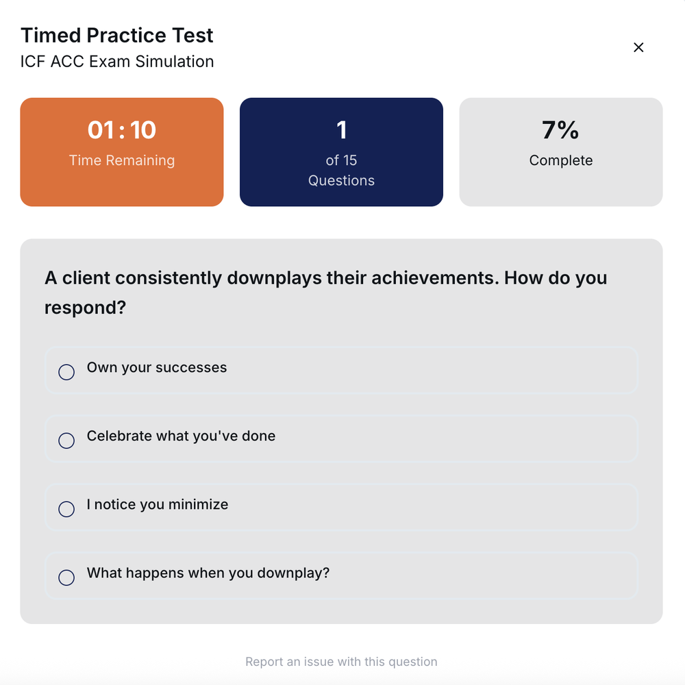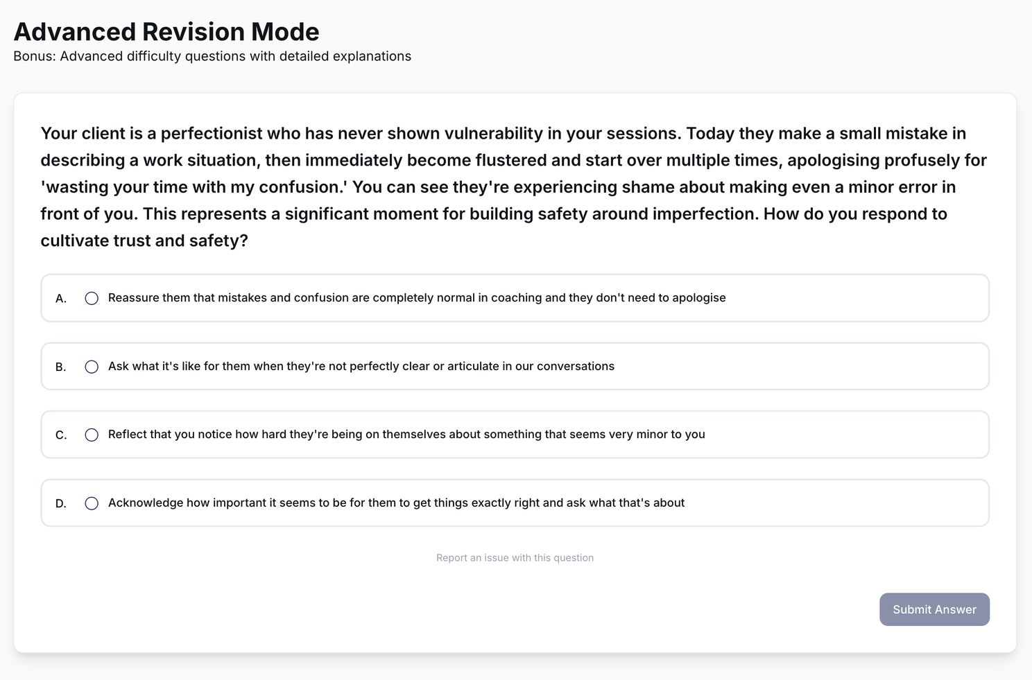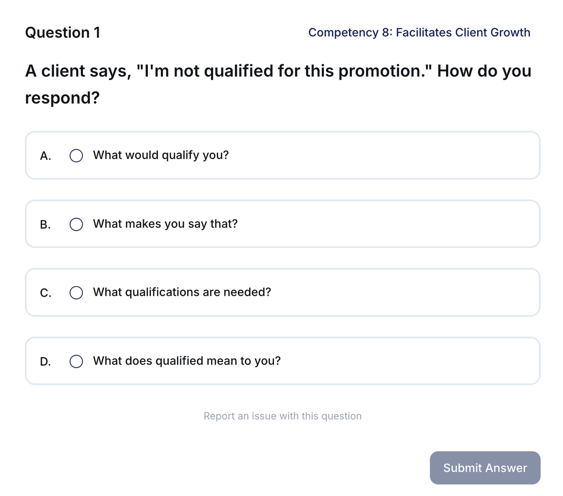 For the sheer love of a challenge, we have included a small number of ‘harder’ revision questions, with instant results provided. These are more of a PCC level question. In keeping with the ACC exam structure, you only need to choose the best answer. In the PCC exam, you must choose the best and the worst (and selecting the worst one is where coaches fall down – our PCC Exam Prep Tool is in progress 😉).