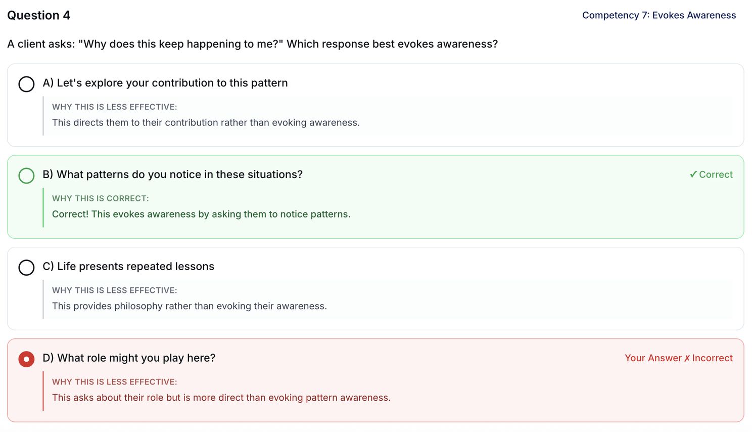 We created this tool to help coaches build their exam confidence, one question at a time. No one but you knows which questions you’ve answered, or whether you got them right or wrong. No one but you knows your test results other than you. You can answer as many questions as you like and take as many tests as you like until you feel confident enough to tackle the real exam.
